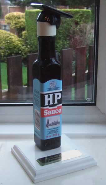 The engraved plaque was a few quid from a local engraver, and has the regular name, year, and achievement details, but the label sides are full of HP Sauce rhetoric.